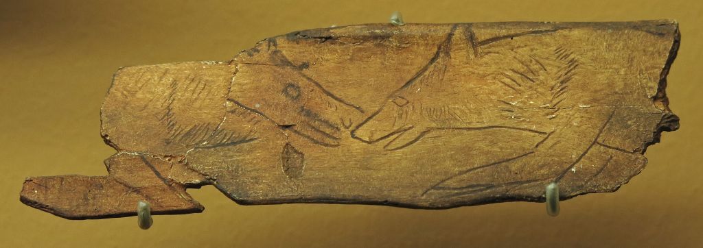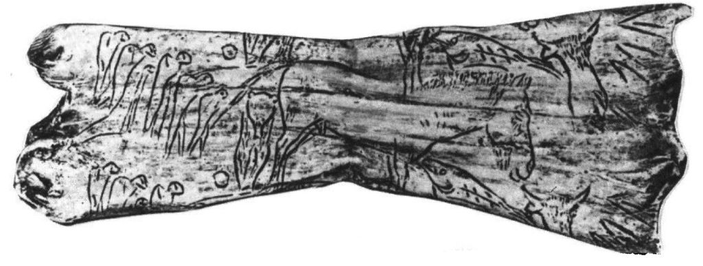Un/ león/oso aparece grabados en un hueso, persiguiendo a un caballo ante la mirada atónita de un grupo de cazadores (de diverso tamaño y condición)